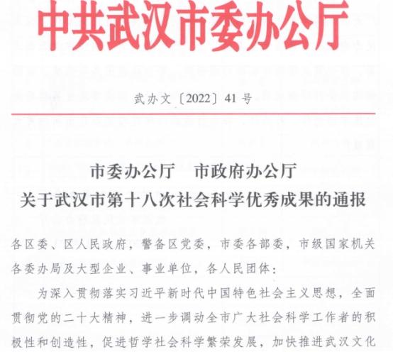 武汉市社会科学优秀成果奖是武汉市人文社会科学成果最高奖项,由中共武汉市委、市人民政府联名授奖,评审程序严格,每两年评选一次,属于副省级奖项,这是beat365官网首次获得等级奖。该奖项旨在加强社会主义现代化建设特别是武汉改革开放和经济社会发展重大理论和实践问题研究,大力推进学科体系、学术观点和科研方法创新,加大武汉社科强市建设步伐,全面推进新时代武汉高质量发展。