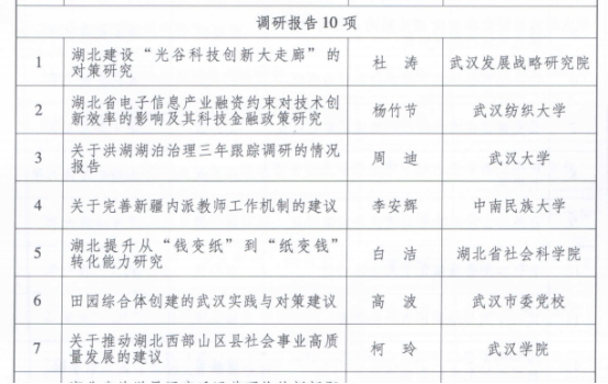 11月23日,中共武汉市委办公室、市政府办公室公布了“武汉市十八次社会科学优秀成果奖获奖名单”。其中,我院财税系专任教师柯玲博士与教务处副处长韦玮博士申报的调研报告“关于推动湖北西部山区县社会事业高质量发展的建议”荣获三等奖。