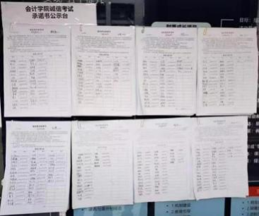 图为会计学院组织全院近三个年级的1893名同学手写“诚信考试承诺书”并予以公示,为提高同学们的考试质量和杜绝舞弊行为起了很好的警示作用。