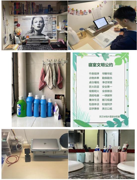 1117寝室所住的四名男生来自该校外国语学院,走进宿舍,映入眼帘的是整齐的窗帘、干净有序的桌面及洗漱台、整洁的床铺,以及有序摆放的鞋架。此外,宿舍里生机盎然的小绿植,文艺复古的小熊花束,积极励志的海报贴画等也让人耳目一新。寝室对他们来说是学习的天地,更是满满温馨和谐的“家”。