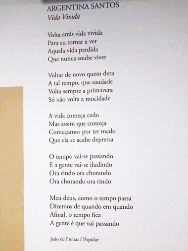 我们的导游是一位当地大学毕业的中国年轻人,翻译专业。她拿出在参观法朵博物馆时的一件翻译作品,是被誉为“法朵最后一位伟大歌唱家”的阿根廷·桑托斯(Argentina Santos)的《活过》(Vida Vivida),虽然只有歌词,已尽哀伤之意。