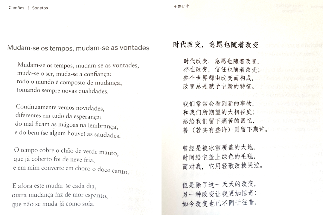 在里斯本大学校园的卡蒙斯雕像前,不仅想起这几天翻阅过他脍炙人口的诗集,内容与当时波澜壮阔的时代紧紧相联。其中一首《时代改变,意愿也随着改变》(Modam-se os tempos, mudam-se as vontades)让我印象相当深刻,这里摘录诗中首尾两段: