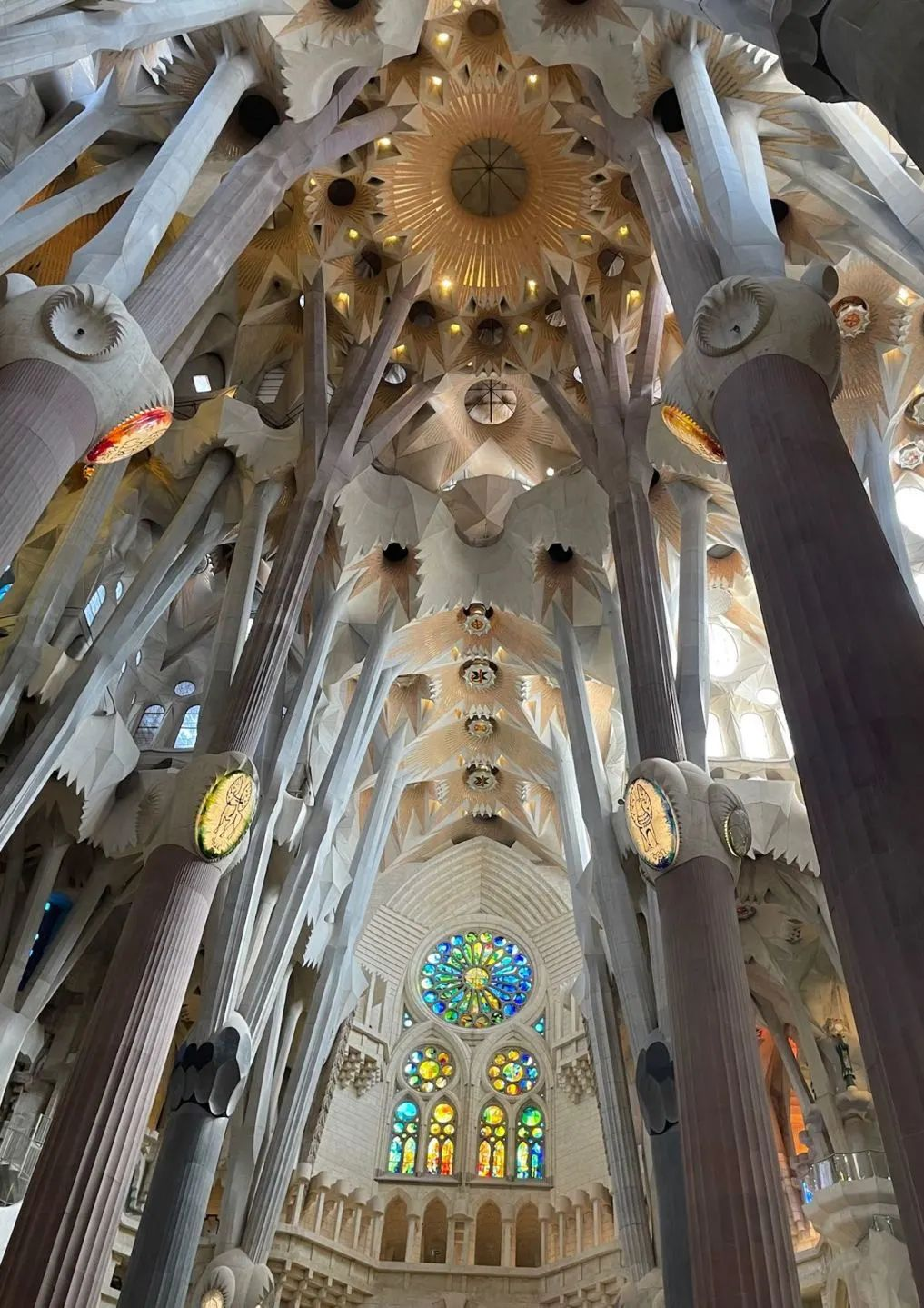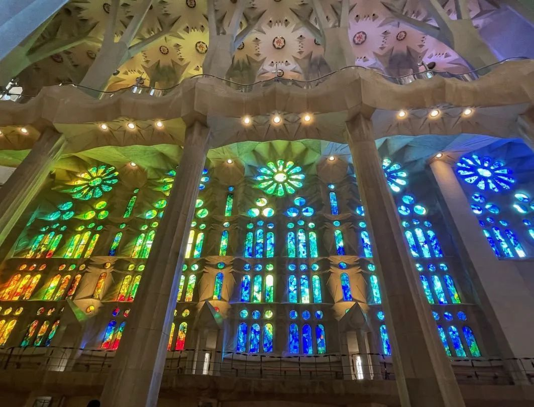 高迪曾说,色彩是生命的动人之处。在圣家堂内部,高迪巧妙利用了自然光的光效和色彩,玻璃窗除了传统的红色和蓝色之外,还大量使用绿色和黄色,代表了新生与死亡,也寓意着四季的更换,增强了圣家族大教堂的感染力与庄严感。