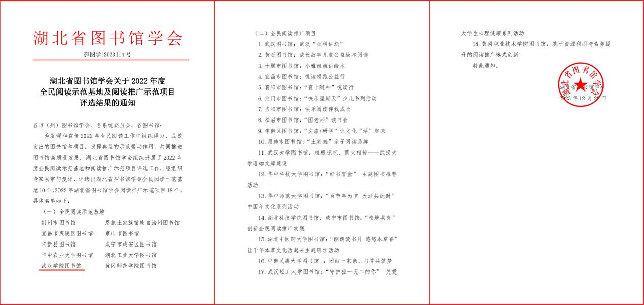 近年来,学校图书馆充分发挥馆藏文献资源和空间资源的优势,积极弘扬中华优秀传统文化,激活红色文化,培育和践行社会主义核心价值观,积极构建全校立体阅读推广体系,组织策划了一系列理念新颖、内容丰富、品牌效应较好的阅读推广活动,不断扩大自身影响力,并屡获不同层级的行业表彰。2019年入选全国“中华传统文化经典·推广图书馆”,是湖北省唯一一家获此殊荣的高校图书馆,2021—2023年连续三年获评“文津图书奖联合评审单位”。