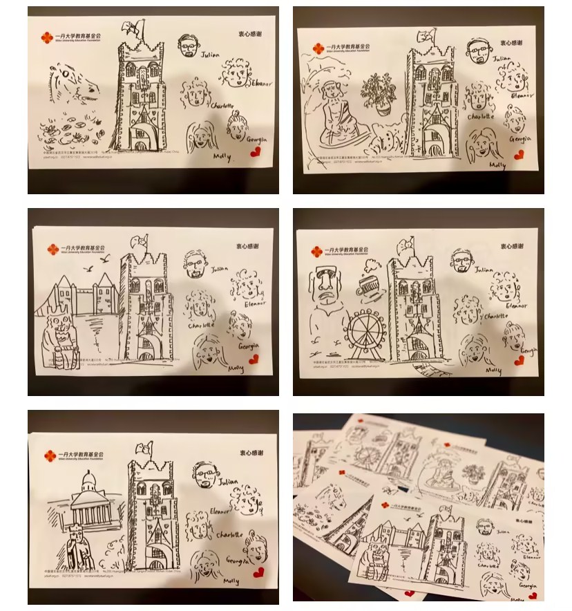 访学团的李锐同学还特意为每位剑桥Intellectual Forum和耶稣学院的老师们准备了自己的一份插画感谢信,上面有老师各自的漫画头像,以及每封不同的英国地标小插画,感谢他们组织了这么丰富的访学活动!(每张感谢插画都有不同哦!)