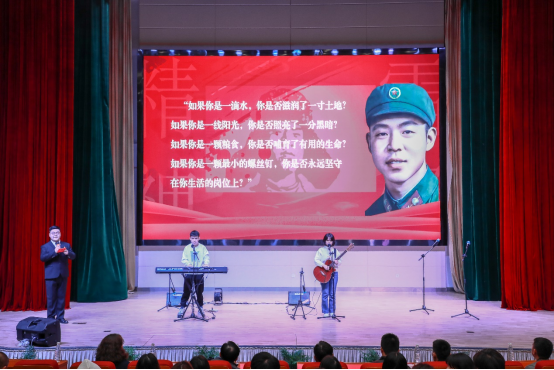 “学习雷锋好榜样,忠于革命忠于党,爱憎分明不忘本……”随着昂扬整齐的旋律响起,音乐团课在VMV乐队成员刘雅倩、张嘉俊演奏的《学习雷锋好榜样》中拉开了序幕。现场的观众默契地随着演唱者刘雅倩、张嘉俊的歌唱声打起了拍子。主持人将一则则感人的故事娓娓道来,现场的师生随着演唱者美妙的歌声沉浸式感受雷锋精神的强大力量。