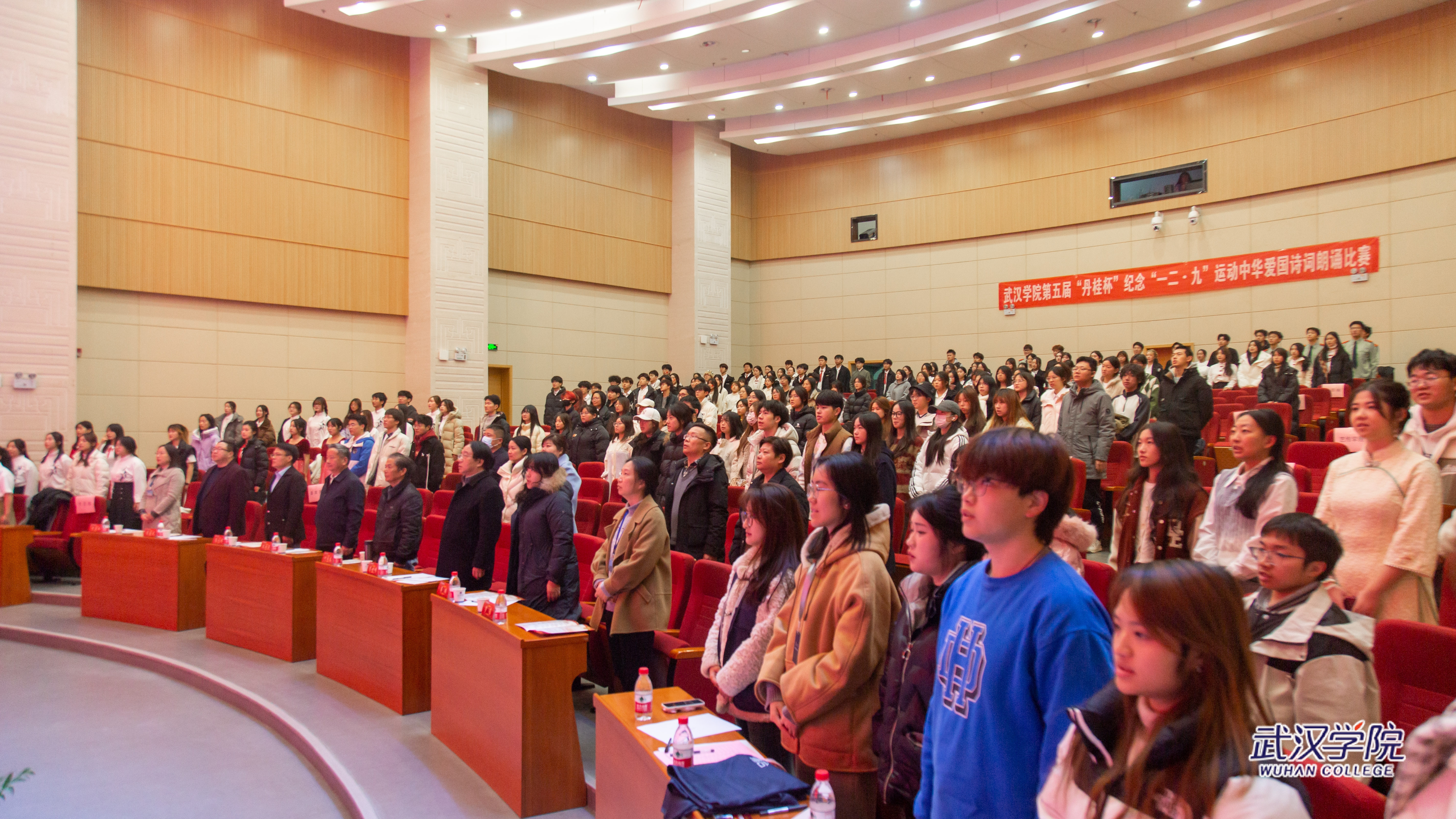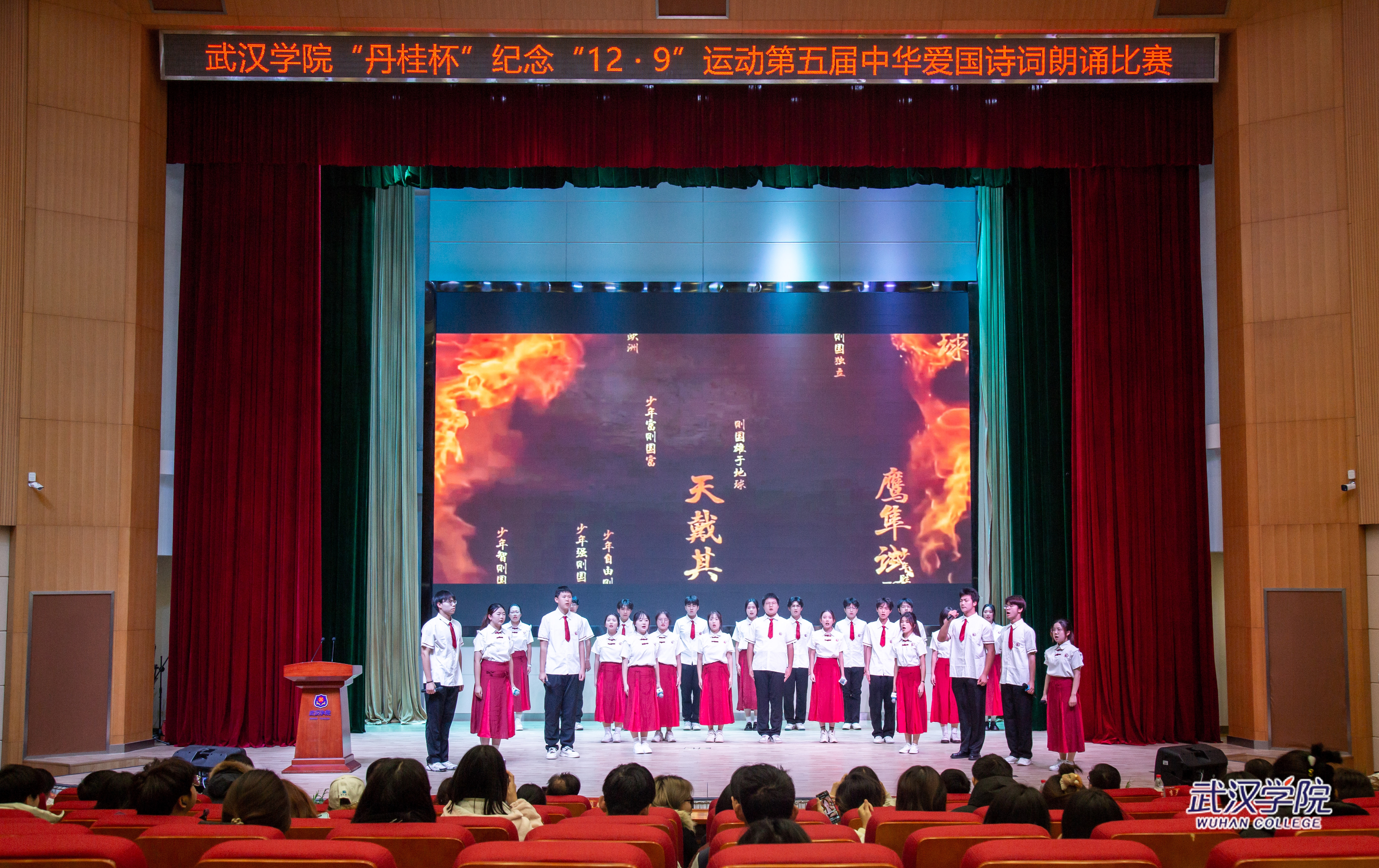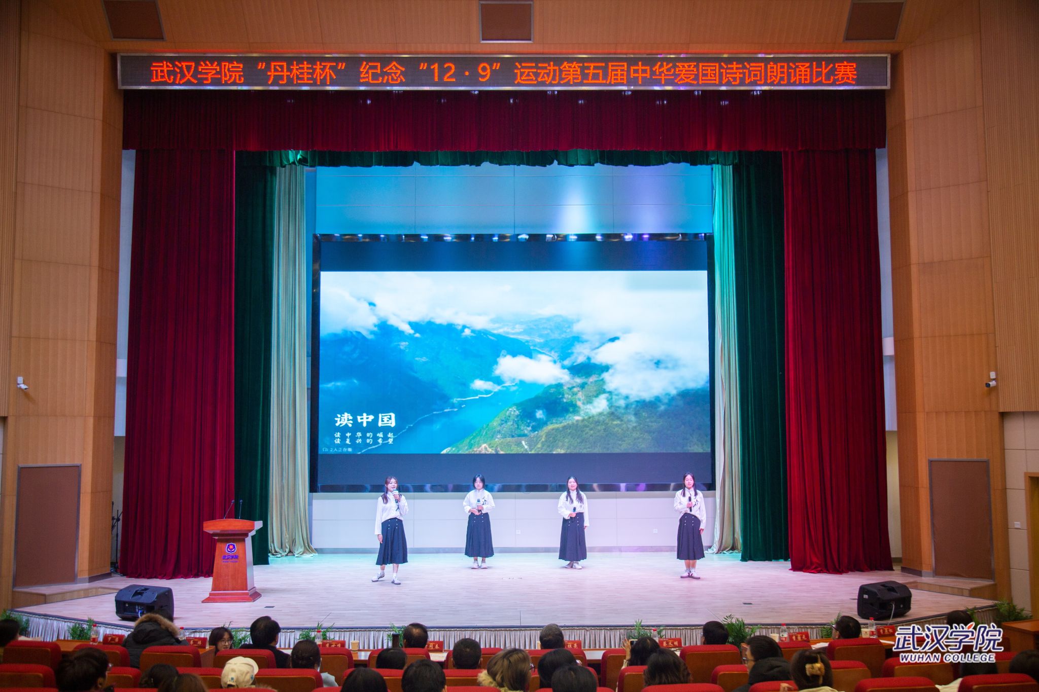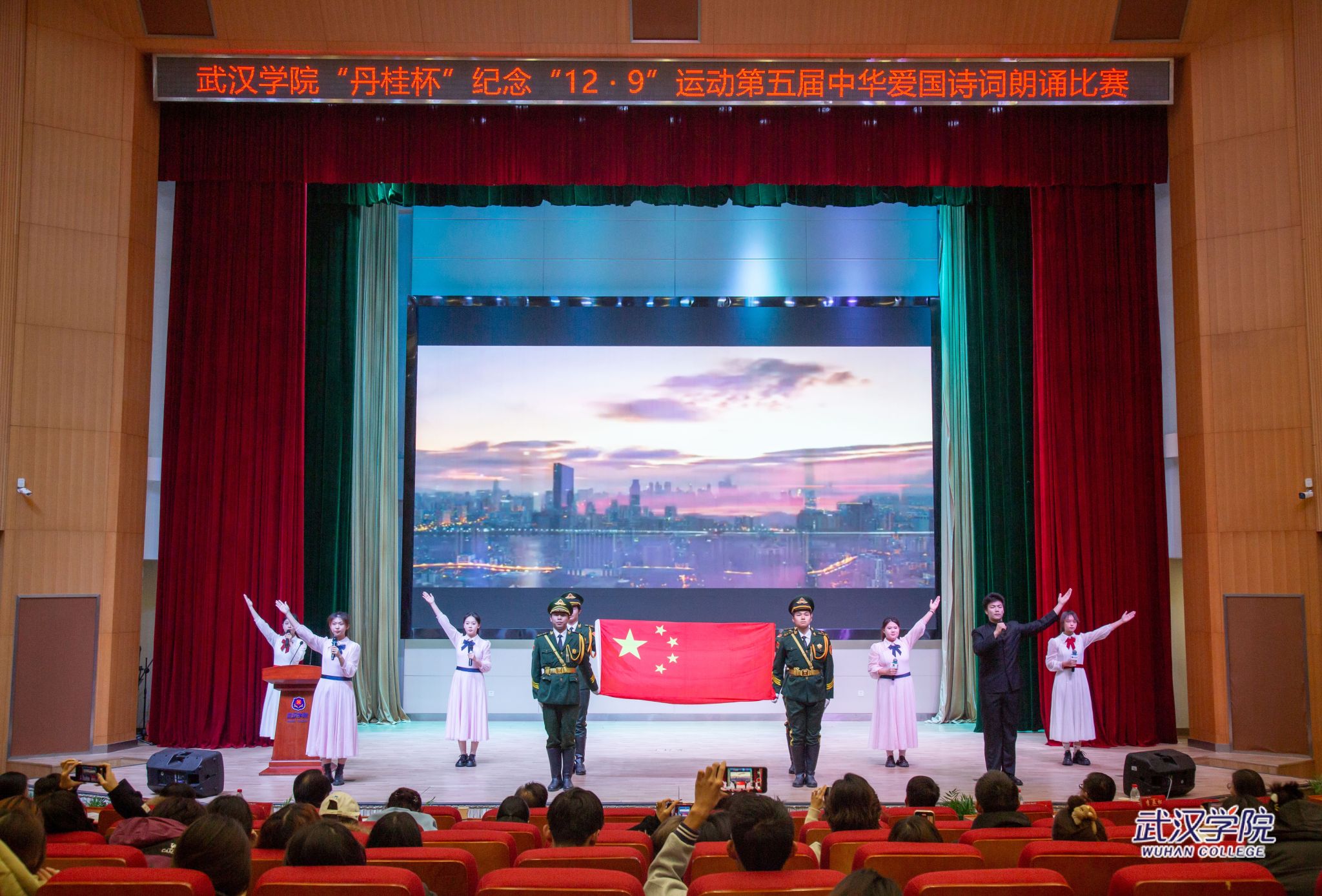 为纪念“一二·九”抗日救亡运动,12月9日晚,以“踔厉奋发新时代,勇毅前行新征程”为主题的丹桂杯第五届中华爱国诗词朗诵比赛在刘炽平报告厅举行。
