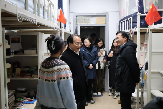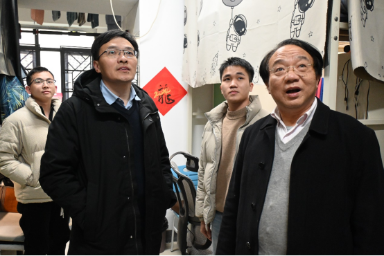 参观考察过程中,黄保红实地询问同学们寝室各项生活设施是否完备、使用是否方便;在谈到宿舍文化建设时,他指出宿舍应做到勤打扫、善保持。学工处处长李世峰则亲切地关心同学们的学习情况以及课余生活,还贴心提醒同学们冬天勤通风、防感冒。来到文化特色宿舍,同学们正在复习备考,墙上张贴着同学们亲手写的对联,书卷气息十分浓厚。看到同学们认真学习,黄保红询问同学们每天作息情况,同学们笑着回答道“每天11点前上床睡觉,绝不熬夜,保持充足的睡眠迎接第二天的学习”。