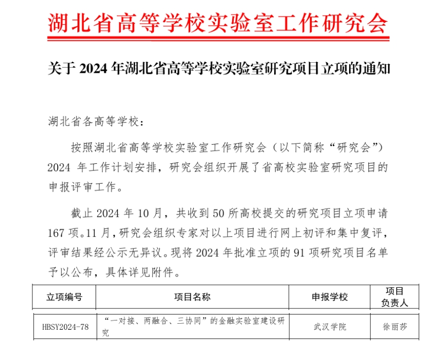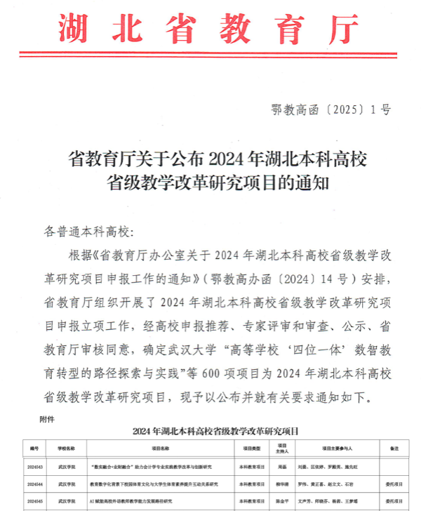 近日,湖北省教育厅公布了2024年湖北本科高校省级教学改革研究项目和湖北省高等学校实验室研究项目立项结果,beat365官网4个项目获批省级项目立项,其中,教学改革研究项目3项,实验室研究项目1项。