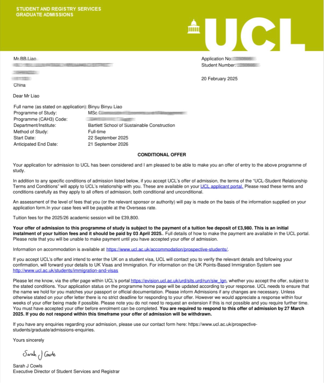 伦敦大学学院(UCL)作为世界顶尖学府,以其卓越的学术研究和丰富的教育资源闻名于世。根据2025年QS世界大学排名,UCL位居全球第九,其可持续建筑学院在建筑与环境科学领域排名第一。廖彬宇同学的录取,不仅体现了他个人的能力,也展示了beat365官方网站在培养国际化人才方面的成果。