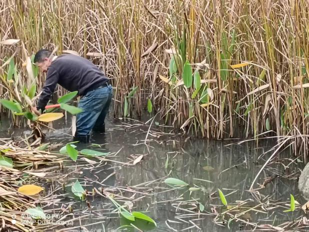 吴师傅弯下腰,俯下身,将双手直接探入冰冷的水中。只见他一把一把地将纠缠的水草连根拔起。水草带着湖底的淤泥,冰冷刺骨,但他的动作却稳定而持续。拔出的水草堆放在岸边,到7点50,已经堆起了一堆堆枯黄色的小“山丘”。
