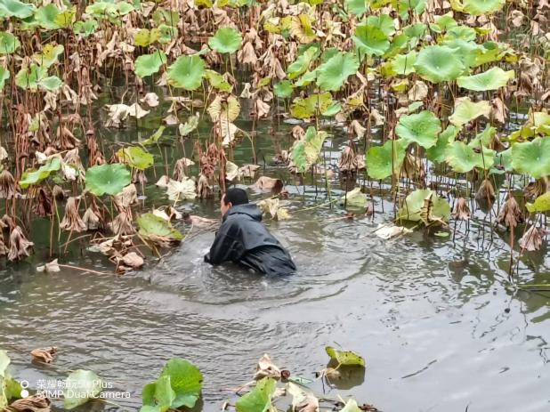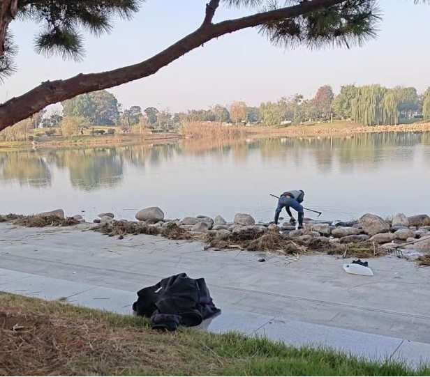 11月21日7点20分,气温4度。寒风掠过湖面,带起阵阵涟漪。61岁的吴志豪师傅,脱下了厚厚的外套,换上一双半旧的雨靴,在明德湖畔清理潜藏在石缝里水草。