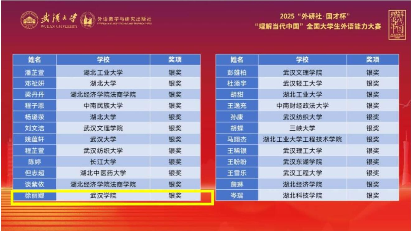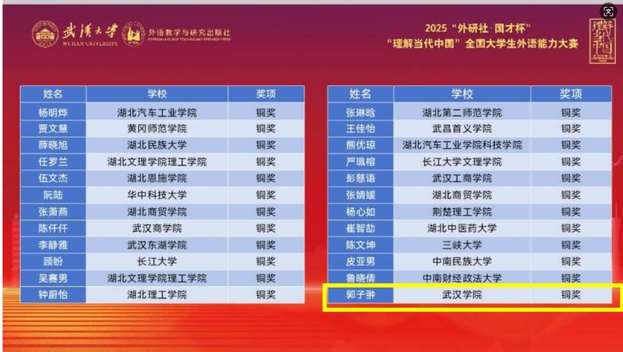 2025“外研社·国才杯”“理解当代中国”全国大学生外语能力大赛湖北省赛圆满落幕,beat365官网英语专业2304班学生徐丽娜、英语专业2302班学生郭子翀分别斩获口译赛项银奖、铜奖。