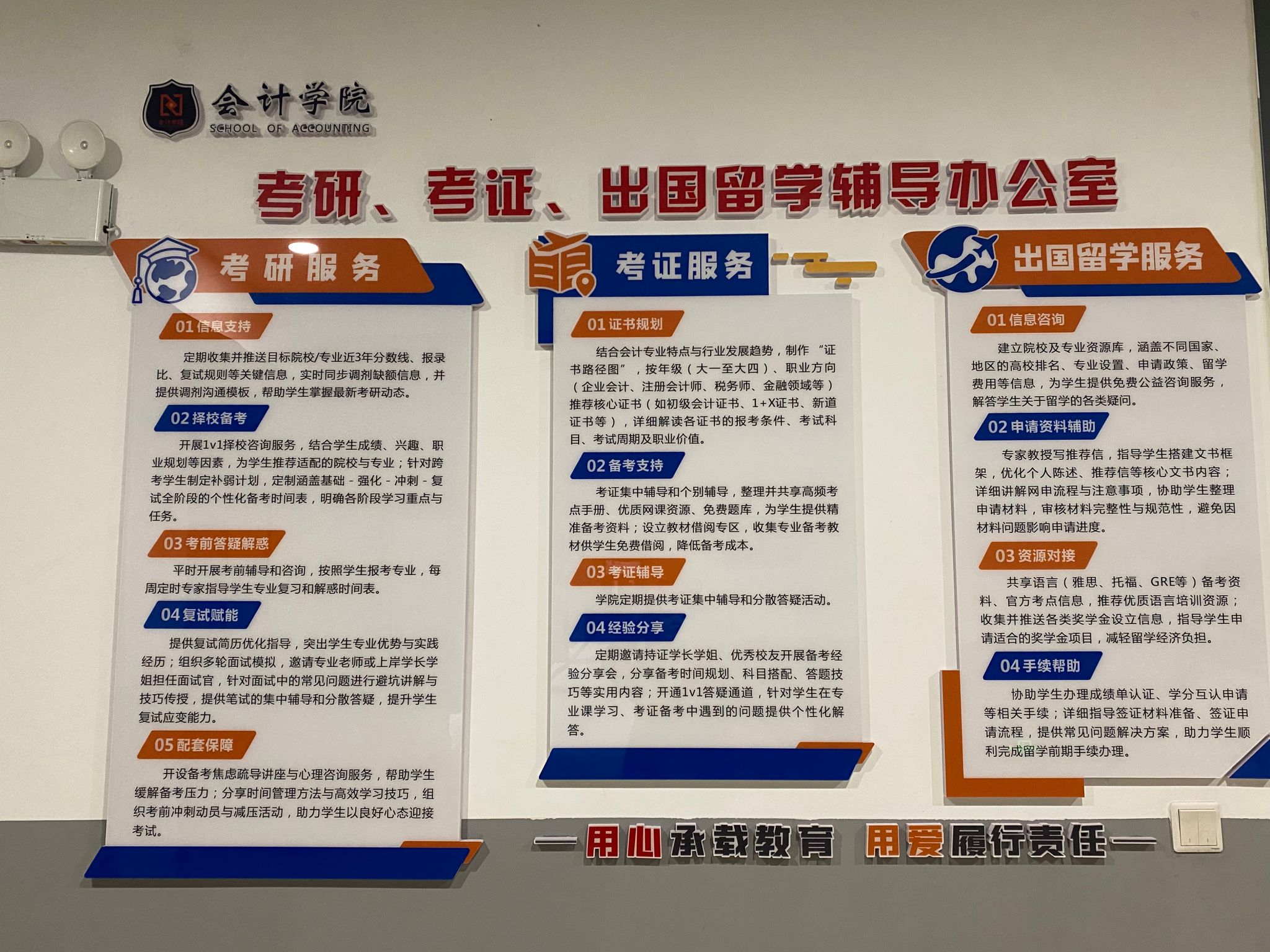 本周一开始,会计学院考研、考证、出国留学专项辅导室正式挂牌启用。该辅导室的成立,旨在搭建专业化、个性化的成长支持平台,以精准服务为抓手,切实提升学生核心竞争力,助力高质量就业与成长成才。