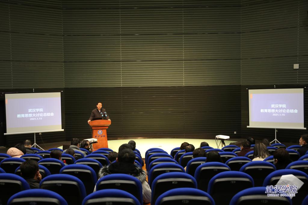 他强调,本次教育思想大讨论已暂告一段落,但教育观念转变、教育思想更新是一个长期的任务。面对新时代民办高校发展的机遇与挑战,希望全校上下能以本次教育思想大讨论为契机,抓住新一轮科技和产业革命及高等教育普及化发展的历史性机遇,立足“应用型、重特色、国际化”的办学定位,坚持扎根中国大地、立足湖北武汉,以立德树人为根本,以内涵建设为核心,以改革创新为动力,深化教育教学改革,拓宽“产教融合、校企合作”发展路径,不断提升本科教学质量和学校办学水平,为建成“最受尊敬的民办大学”而努力奋斗。