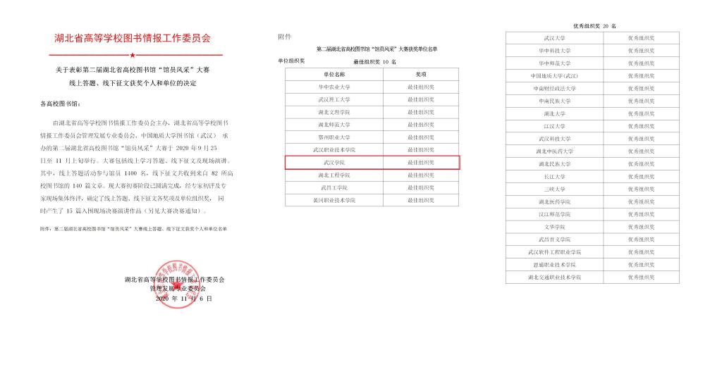 beat365官网图书馆在2019年第一届湖北省高校图书馆“馆员风采”大赛中荣获“优秀组织奖”的基础上,今年积极组织全体馆员参与了此次大赛,以高参与度、高均分、高获奖率的“三高水准”荣获本次大赛“最佳组织奖”。线上答题个人奖项有:馆长温爱莲获一等奖,馆员刘思伶、文雯获二等奖,周莹、熊梦婷获三等奖。