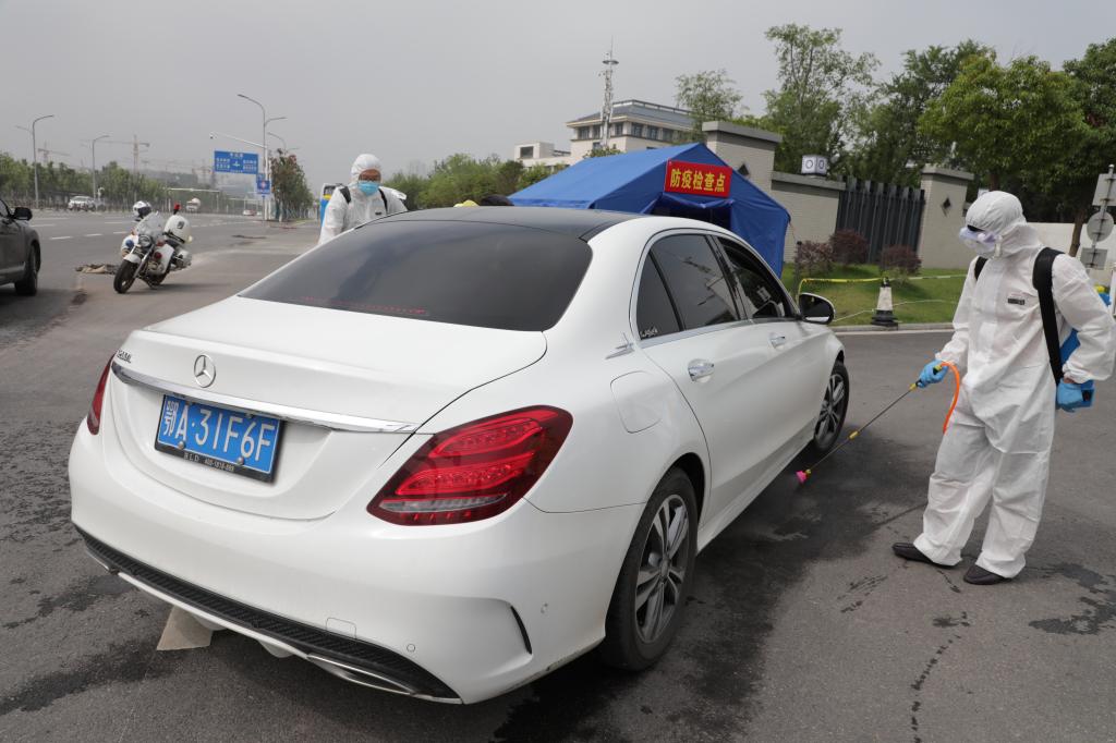 东门车辆入口,所有入校车辆整齐排队,安保人员逐一核查每辆车上人员的返校申请、健康码,测量体温,对车辆进行消毒。