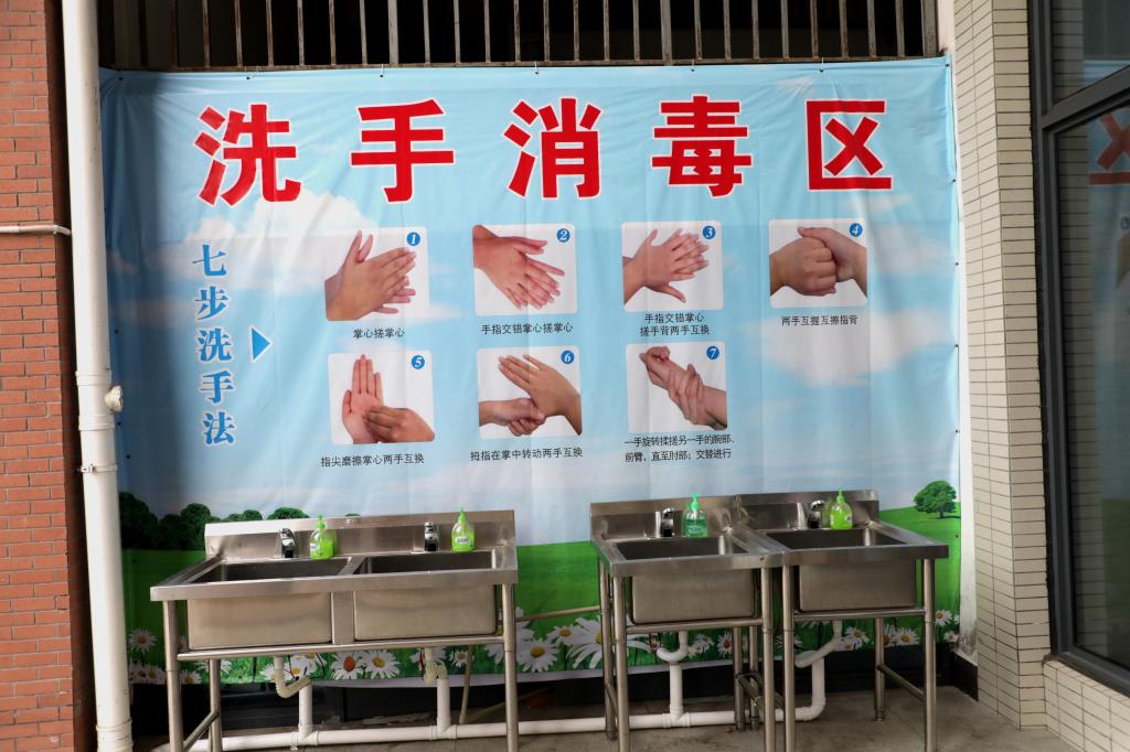 宿舍入口备有消毒液,学生排队测温后进入宿舍。