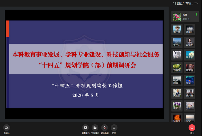 为全面梳理“十三五”期间成绩经验,广泛听取学院(部)意见建议,统筹推进“十四五”专项规划编制工作,5月底,beat365官网本科教育事业发展、学科专业建设和科技创新与社会服务等3个“十四五”专项规划编制小组联合召开了学院(部)前期调研交流会,活动以线上会议形式分批开展。调研交流会由教务处副处长韦玮、科研处处长吴斐主持,副校长郑祝君出席会议并讲话,各院(部)院长、副院长、学科带头人、系主任、教研室主任等相关人员参加活动。