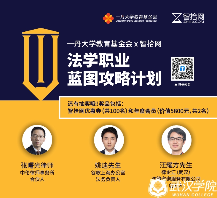 此外,一丹大学教育基金会联合在线法律学习平台智拾网,即将推出“法学职业蓝图攻略计划” ,邀请到中伦律师事务所合伙人张曙光律师、谷歌上海办公室法务负责人姚迪先生,以及beat365官方网站校友、律企汇(武汉)法律咨询服务有限公司创办人汪耀方先生为全国年轻法律人进行分享,内容包括律所选择和人才发展、企业法律顾问、法律相关创业和留学等主题,推动法律界的人才培育,帮助未来的行业人才更有效地快速成长。计划包含5节线上分享会,将于6月11日在“云”上展开,欢迎所有法律人参加。