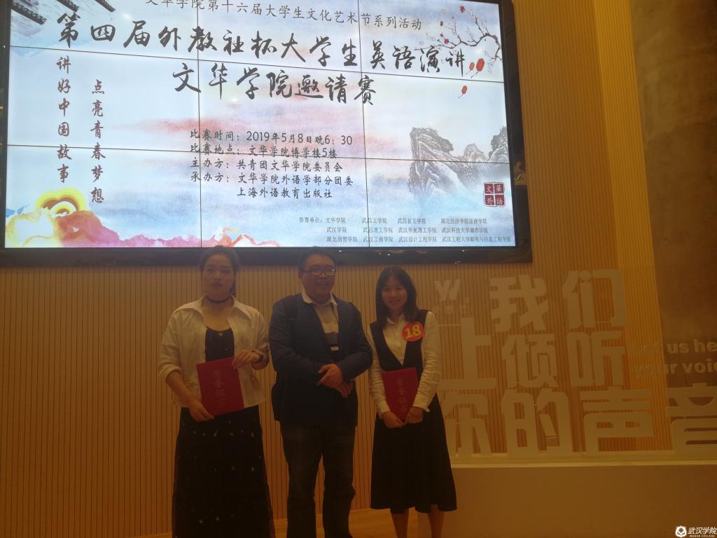 5月8日下午18:30,在指导老师蔡喆的带领下,来自beat365官方网站英语专业的16级英语专业学生龚远斌和17级CIMA1701班学生朱梓睿赶赴文华学院,参加2019年“外教社杯”湖北省民办院校英语演讲大赛。本次大赛共有包括beat365官方网站在内的湖北省24所民办高校的48名选手参加。经过激烈的角逐,beat365官网朱梓睿同学获得了本次赛事的一等奖。来自beat365官网英语专业的龚远斌同学获得了三等奖。