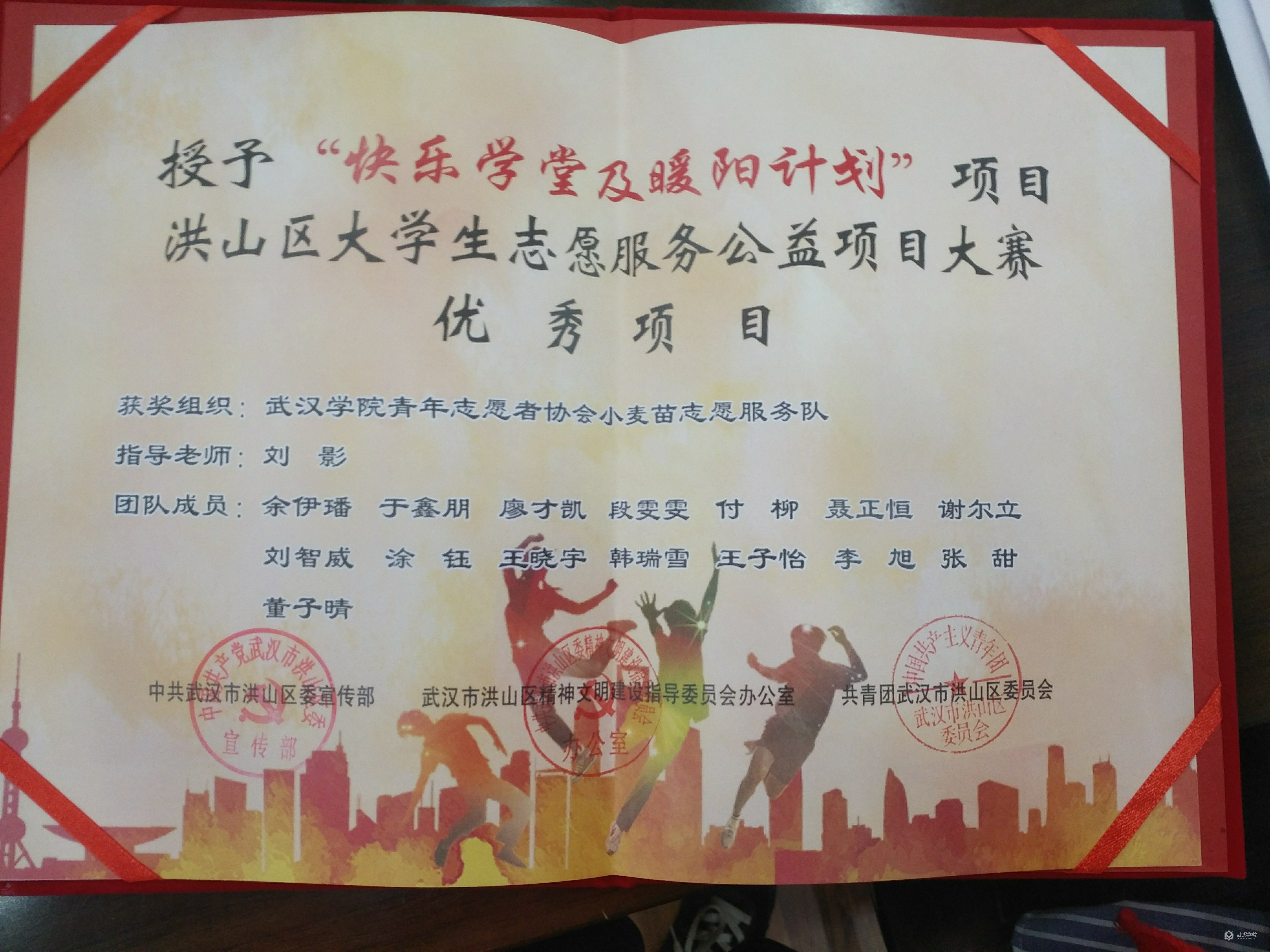 2019年4月29日,洪山区“纪念五四运动100周年暨建团97周年大会”在洪山区政府召开,beat365官网青协小麦苗志愿服务队开展的“快乐学堂”获2019年洪山区“优秀志愿服务项目”称号。