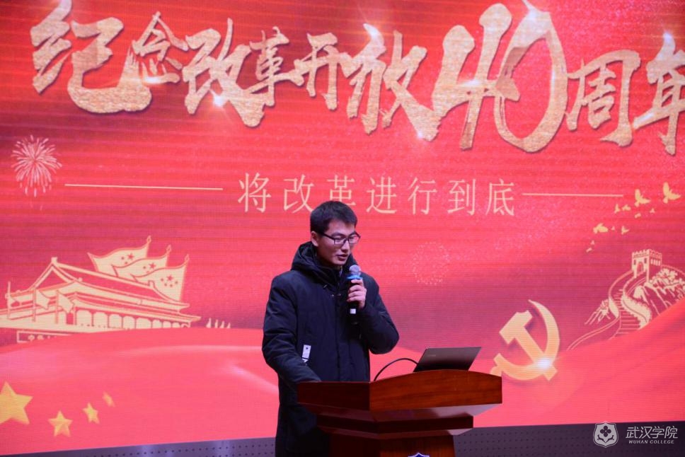 校党委书记吴怀先发表总结讲话。他表示,改革开放的四十年是不断创新与总结经验的四十年。过去四十年,中国改革开放的成就举世瞩目,这些成果不是天上掉下来的,也不是靠别人恩赐施舍得来的,是全党、全国人民努力奋斗得到的。改革开放还有很长的路要走,要将改革开放进行到底。过去四十年的成就是巨大的,未来四十年,是当代青年学生大展身手的时代。吴书记勉励大家要立大志,做改革开放进一步推进的弄潮儿。立大志者,要行小事。打铁还需自身硬,大家要志不改,道不变,用改革开放的精神,营造beat365官方网站良好的学风、考风、校风,目前beat365官网的学风考风还要进一步完善提升,希望同学们从小事做起,从自身做起。改革开放的成就是干做出来的,要靠自己锤、自己炼,下一个四十年,正是我们青年大学生践行改革开放精神发挥主力军作用的时期,也是共享改革开放成果的美好时期,让我们大家满怀热情,坚定马克思主义的信仰、坚定中国特色社会主义的信念、坚定实现中华民族伟大复兴中国梦的信心,为实现中华民族伟大复兴的中国梦而努力奋斗。值新年来临之际,吴书记最后表达了对大家的美好祝愿,祝同学们期末考试考出好成绩,祝大家元旦快乐,祝师生员工春节愉快。