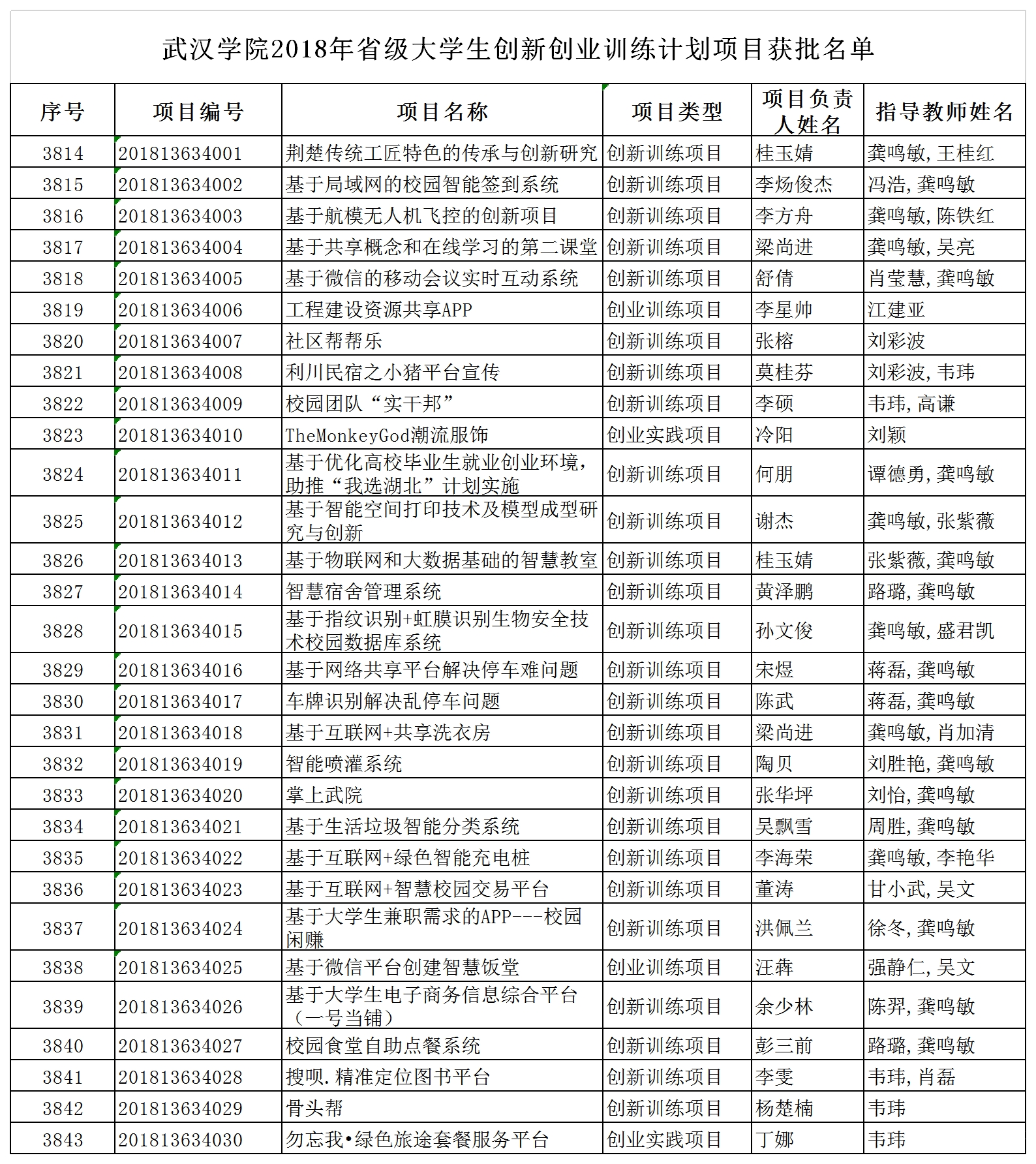 湖北省教育厅下发《省教育厅关于公布2018年省级大学生创新创业训练计划项目的通知》(鄂教高函〔2018〕21号),beat365官网30个项目入选,其中创新训练项目26项,创业训练项目2项,创业实践项目2项。