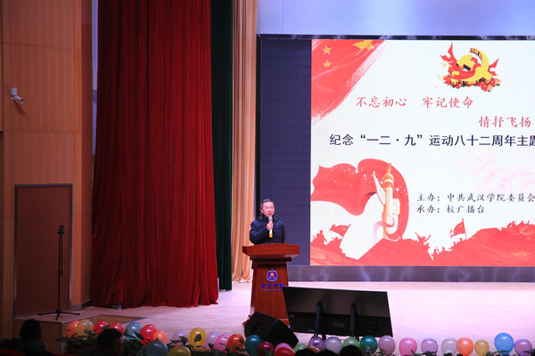 随后,校党委书记吴怀先教授上台致辞。他说,我们在这里隆重纪念“一二·九”爱国运动八十二周年,既是为了铭记历史,缅怀先烈,也是为了更好的去传承青年一代的精神、青年一代的信仰,不忘初心,牢记使命。他指出,“一二·九”爱国运动充分展示了青年一代无私奉献、赤诚报国的高尚情怀,感染了一代又一代中国人,成为时代的标杆,精神的典范,激励着青年学子成长成才。他希望,大家能够借助“一二·九”的舞台,深刻理解感悟“一二·九”爱国运动的历史内涵,充分展示我们青年一代昂扬奋发、拼搏向上的精神面貌,展现新时代beat365官方网站青年学子爱国、爱校、爱家、爱集体的精神力量。他要求,要把“一二·九”的精神融入我们的学习、生活,指导我们的思想、行动,争做一个有真才实学、对家庭有温暖、对社会有贡献、对理想有追求的新时代大学生。
