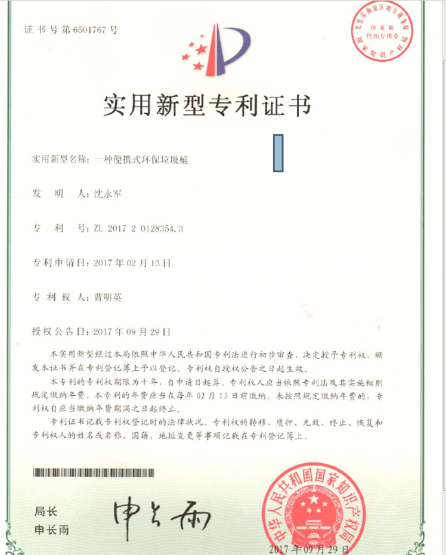 据悉,沈永钧老师发明的专利是便携式环保垃圾桶,其通过优化的结构改进设计,可以实现易折叠、便携使用等功效,而且打开时稳定性好,不容易倾倒。另外,其通过收口线的设计可以实现快速简单收口,不易倾洒,可以有效解决户外活动时,垃圾袋使用麻烦、垃圾桶携带不方便问题。