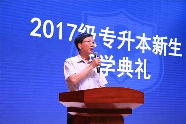 刘科成副校长代表学校对2017级专升本的同学们表示热烈的欢迎并提出四点殷切希望:一是要注重修身,立德立人。二是要淡泊明志,脚踏实地。三是要刻苦努力,潜心求学。四是要勇于担当,全面发展。