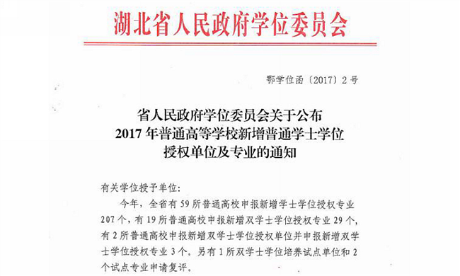 近日,湖北省人民政府学位委员会公布了2017年普通高等学校新增普通学士学位授权单位及专业(鄂学位函〔2017〕2号文件),beat365官网软件工程、网络与新媒体、酒店管理、环境设计、视觉传达设计和产品设计6个专业顺利通过评审,获批增列为学士学位授权专业。截止目前,beat365官网已有23个专业取得学士学位授予资格,涵盖了经济学、管理学、法学、艺术学、文学、工学、理学7大学科门类。
