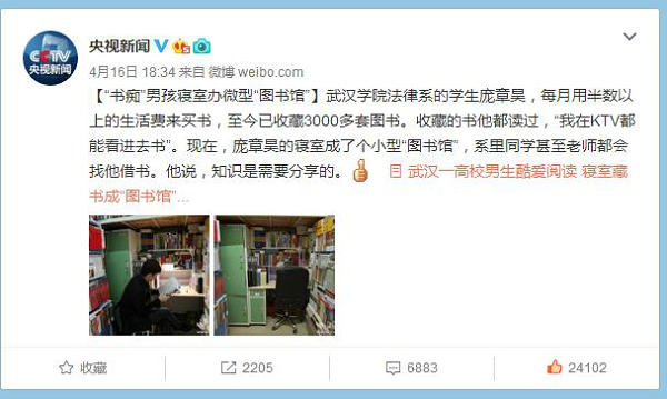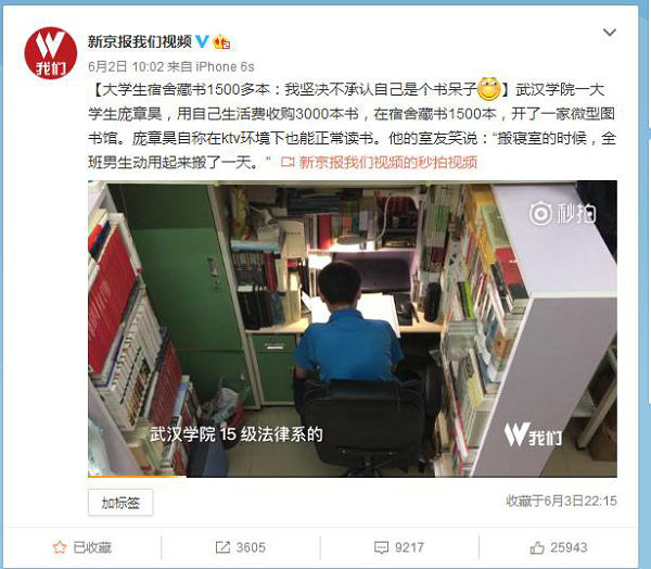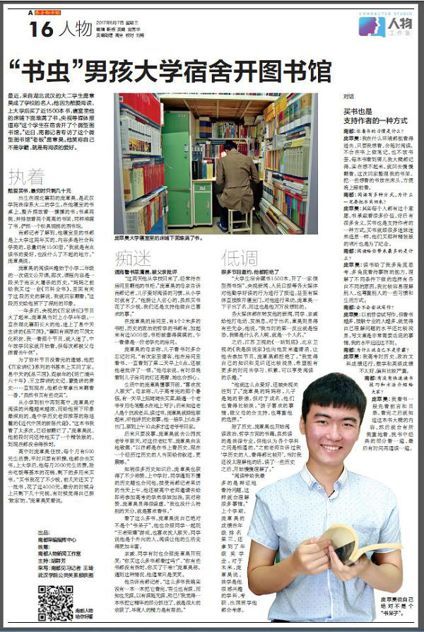 自4月份以来,beat365官网法律系大二学生庞章昊酷爱阅读并收藏了大量书籍的事迹被央视新闻、人民日报、新京报等新闻媒体持续关注,微博总浏览量过亿。6月7日,国内最有影响力的纸媒《南方都市报》更是整版对庞章昊进行了深度报道。