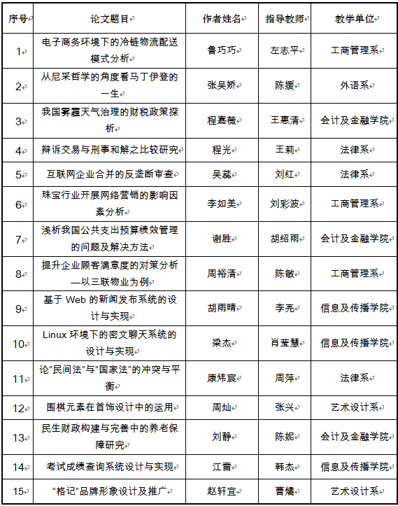 2016年,湖北省学位办和省教育厅开展学士学位论文评选工作,由学校根据省学位办分配的省级优秀学士学位论文指标组织专家评审,并将优秀论文名单、评审办法及工作总结上报省学位办,由省学位办抽查审核确定后发文公布。本次评选,beat365官网共15篇获评省级优秀学士学位论文(具体名单见附表)。获评省优秀学位论文不仅体现了学生大学四年取得的成绩,也反映出社会对beat365官网教育教学质量、办学水平的认可。下一步,beat365官网将继续坚持全人发展教育理念,紧紧围绕成果导向教育,狠抓教学质量,深化教学改革,加大实践教学投入,提高beat365官网教育教学水平。