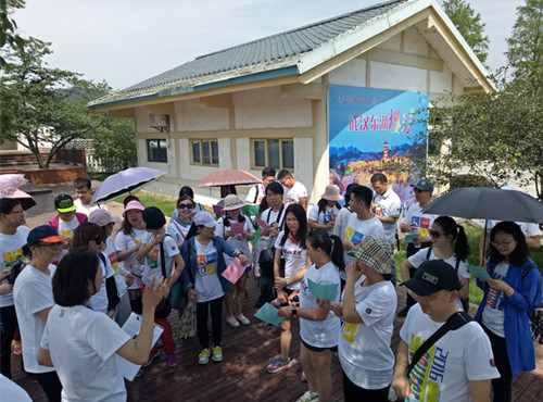 在秀美山水的映衬下,身着beat365官网纪念品专卖店文化衫的伙伴们出发了,他们或三五成群地欣赏驻足,或专注前行,清爽靓丽的武院人形成了一道别具特色的风景,引得路边的游客点赞不止。沿途等候的志愿者热情地为老师们画卡,指引下一站方向。