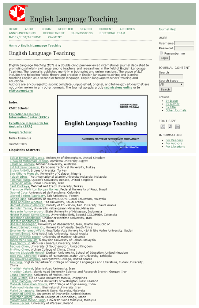 English Language Teaching (ELT)是一本由加拿大科学与教育中心主办的面向全世界发行的国际期刊,主要致力于英语教学领域的教科研人员的学术交流,实行同行双盲审制度。该期刊为月刊,每月发行纸质版和电子版。主要栏目有:英语教学理论与实践、英语二语(外语)教学、英语教师培训与教育等。