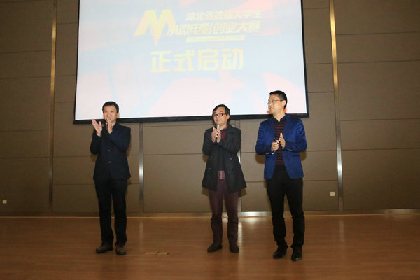 最后,共青团湖北省委宣传部部长及文化传播中心主任王兵、湖北省电影家协会驻站副主席余述平、湖北日报新媒体集团副总经理郑阳一起上台,三人通过手机点亮大屏幕,正式启动湖北省首届大学生小微电影创业大赛。