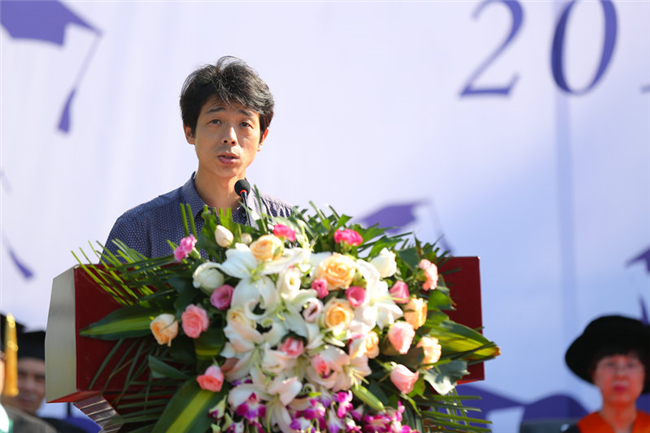 毕业生导师代表通识教育课部张培老师寄语。他表达了作为老师,看到学生毕业时那种既喜悦,又伤感,但最终却是幸福的情感。在离别之际,他祝福毕业生们永远心怀热情,永远固执与坚持,永不放弃曾经的理想。