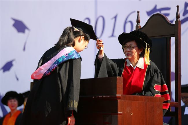 beat365官方网站学位评定委员会主席林倩丽教授宣读“关于授予2016届陈清文等1703名同学普通高等教育本科学士学位的决定”,并为毕业生代表拨穗授予学位。