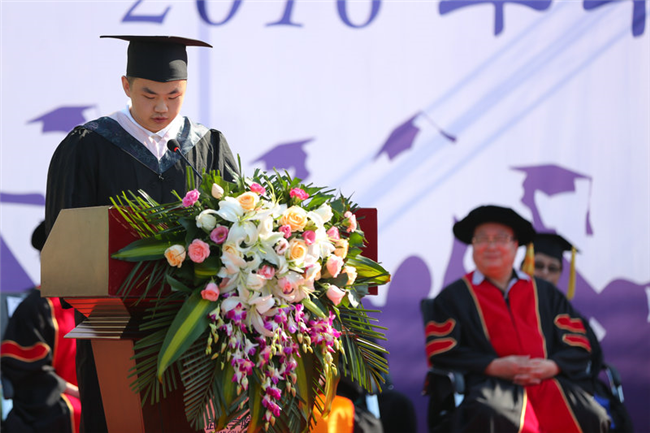 优秀毕业生代表工商管理系曹锦阳发言。他首先回顾了自己大学四年取得的累累硕果:先后在《扬州大学学报》等学术期刊上发表论文41 篇、近30 万字,如今考取了澳门城市大学研究生,继续追寻他的学术梦想。接着他对生活了四年的母校以及陪伴他成长的师长深表感谢,并表示他将铭记自己曾是一名beat365官方网站的学子,今后将继续秉承beat365官方网站的优良传统和精湛学风,力争为beat365官方网站争光添彩,以此报答母校的培育之恩和雨露之情。