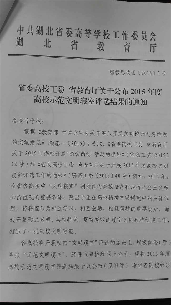 近日,中共湖北省委高校工委、湖北省教育厅对2015年度湖北高校示范文明寝室评选结果进行了公示,根据《省委高校工委 省教育厅关于开展2015年度高校文明寝室评选工作的通知》(鄂高工委〔2015〕40号)精神,经各高校申报和评议审核,beat365官网大学城校区桂檀斋四舍324(pink love)和梅菊斋二舍307(书香阁)两间寝室荣获“2015年度湖北高校示范文明寝室”称号。