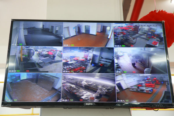 据了解,汉园餐厅内安装了16个摄像头,视频监控覆盖到食堂内的每一个功能区,将食堂内部的情况通过餐厅内的两个大显示屏显示。来往用餐的师生都可以从显示屏中观察到后厨员工的一举一动,食堂的管理人员在办公室内也能实时监控到环境卫生。