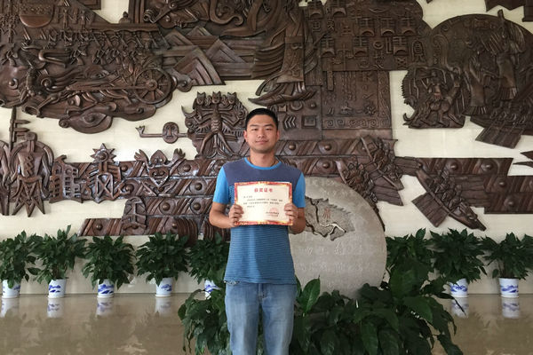 张定手拿证书在湖北日报集团大厅留影