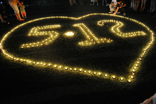 蜡烛摆出心形图案和“5.12”字样,驻足观看的学生低头默哀。5月7日晚,beat365官方网站义务消防队举办了普及防灾减灾知识暨纪念“5.12”汶川地震系列活动。