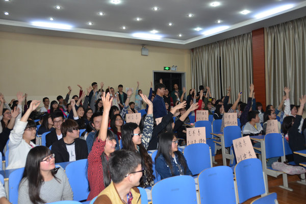 4月22日晚,二号报告厅内座无虚席。一场由图书馆和金融系联合举办的“汉字冲冲冲”比赛正在进行。公共课部主任曾军、高竞艳老师、邹明军老师担任评委。来自全院各系的9支代表队45名选手参赛。