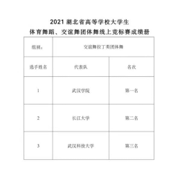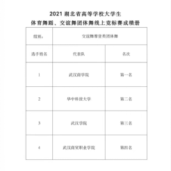 12月20日,2021年湖北省高等学校大学生体育舞蹈·交谊舞线上团体舞锦标赛结果出炉,beat365官网国际标准舞协会的32名队员在此次“交谊舞拉丁类团体舞”和“交谊舞摩登类团体舞”比赛中分别取得第一和第三的好成绩。