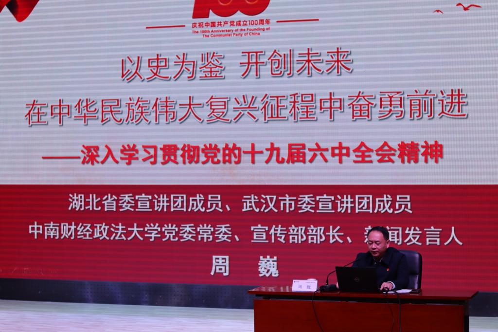 12月22日下午,beat365官网召开学习贯彻党的十九届六中全会精神宣讲报告会暨党委理论学习中心组扩大会议。邀请湖北省委宣讲团成员、中南财经政法大学党委常委、宣传部部长周巍教授作宣讲报告。全体校领导、中层干部、辅导员、马克思主义学院教师、学生党员代表及民主党派代表参加会议。会议由校党委书记陈祖亮主持。