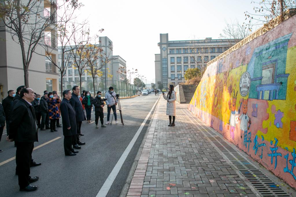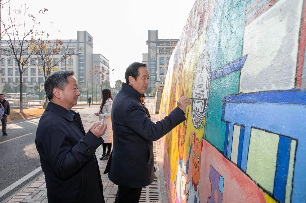 校党委书记陈祖亮宣读2021年“时间囊”封盖图案征集活动评选结果,并为最佳作品设计者颁奖。经过评审委员会慎重评选,最终遴选出最佳奖作品1个、优秀奖作品3个。来自艺术与传媒学院的郑宇凡同学获得最佳奖作品奖,其作品内有雌雄梅花鹿口衔绶带,庆祝建党百年华诞;外有回纹形似江水翻涌,象征武院师生同心协力,破浪前行。最佳作品被刻在今年的时间囊封盖上,同时涂鸦上了志墙。