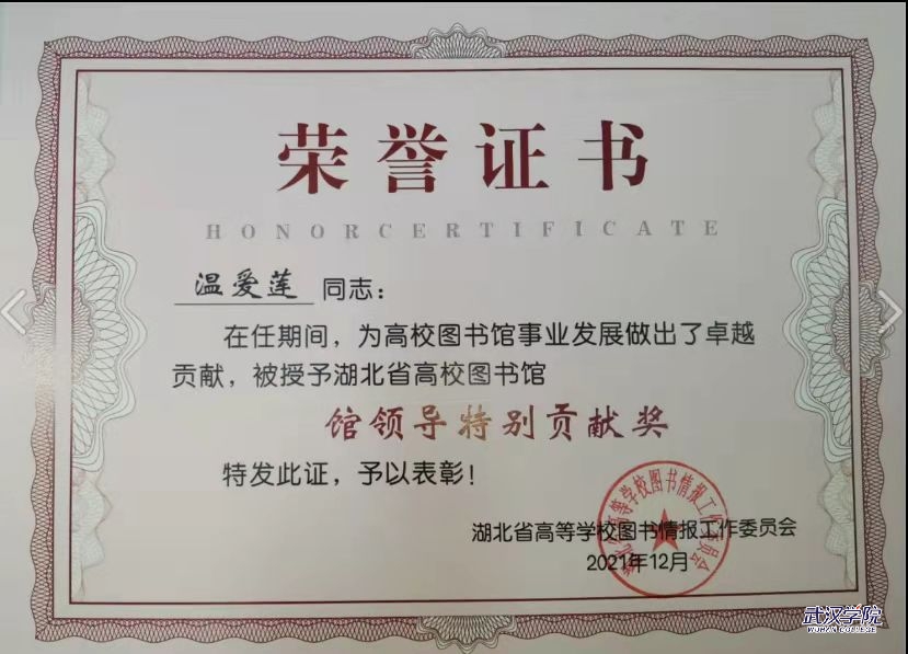 近日,从湖北省高校图工委管理发展专业委员会传来喜讯,beat365官网图书馆馆长温爱莲荣获湖北省高校图书馆首届“馆领导特别贡献奖”和“光荣在馆30年荣誉奖”;图书馆馆员熊梦婷获得全省“先进工作者”称号。