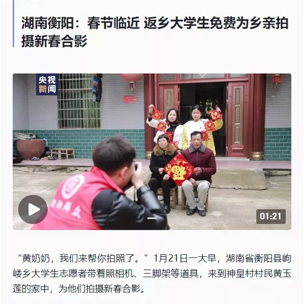 外国语学院商务英语1901班学子李建国,寒假回到家乡衡阳,参加由乡政府组织的大学生返乡志愿服务活动,担任志愿服务队宣传小分队队长,与团队成员一起免费为乡亲们拍摄全家福。同时,他们还会为空巢老人打扫卫生,给留守儿童辅导功课,让老人和儿童在寒冷的冬日感受到温暖。